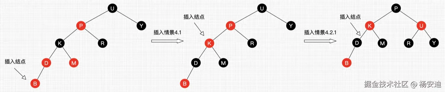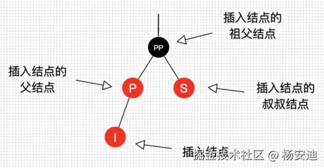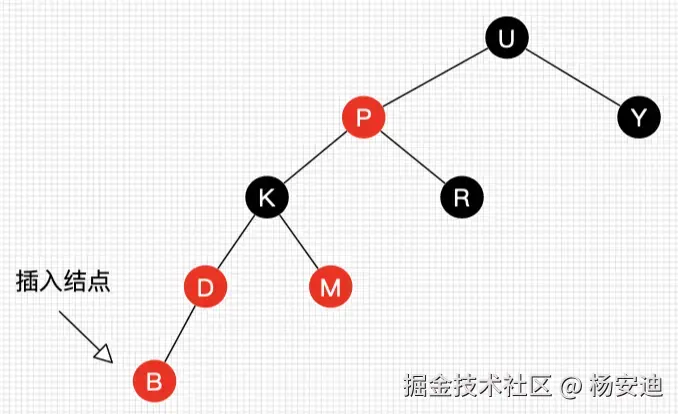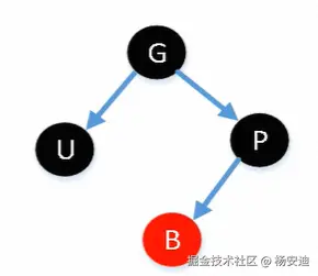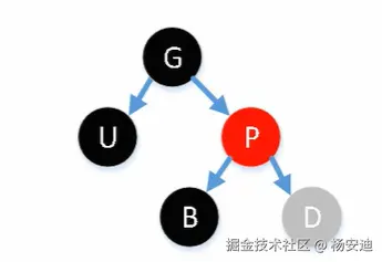 如果插入节点的父节点是红色,那么它的叔叔节点不可能是黑色,因为左右黑高不相等,违反了红黑树的规则,所以只能是不存在叔叔节点