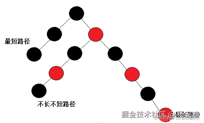 最短路径为全黑,最长路径就是红黑节点交替(因为红色节点不能连续),每条路径的黑色节点相同,则最长路径、刚好是最短路径的两倍。