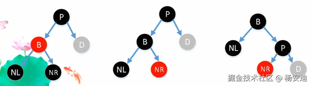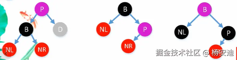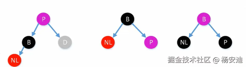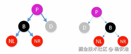 LL型(左左型):以P为中心,先右旋,后变色(兄B变父P色,爷P孙NL变黑)