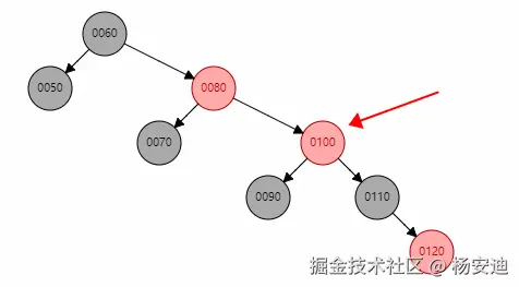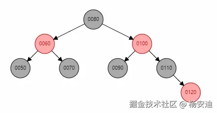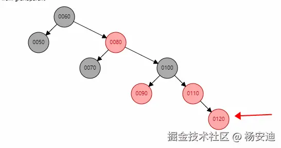 当我插入120时,90和110都要变黑,然后100变红,此时80也是红色,继续将100当成新插入的元素看待,此时就变成了父节点是红,叔叔节点50是黑色的情况了,该怎么做?看3.3.2.2