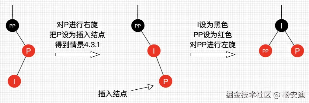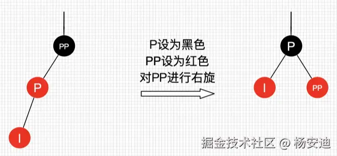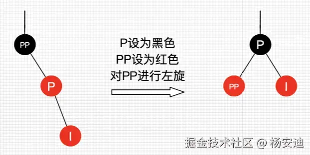 同理,先变色,将父节点P变成黑色,祖父节点PP变成红色,然后对PP进行左旋(因为父子节点都在右边,为了保持平衡,需要左旋)
