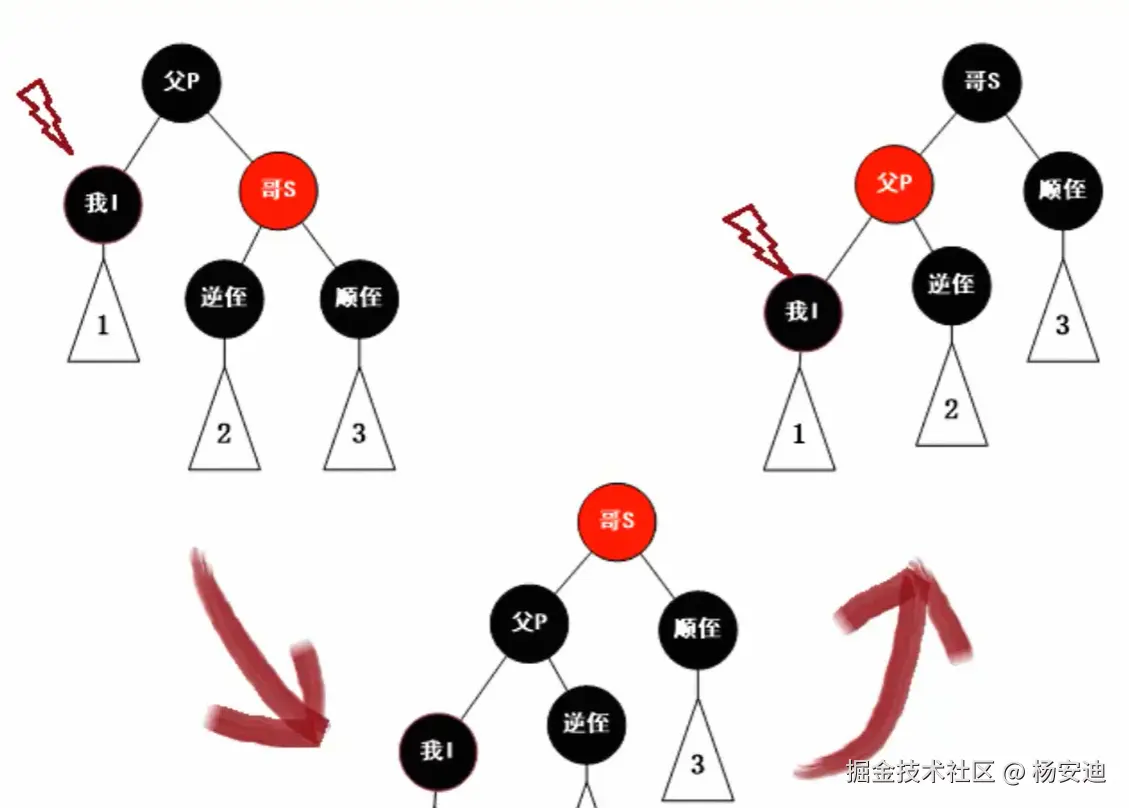 当父子节点不在同一边时,需要先对父节点进行旋转,旋转后就在同一边了,就可以按照父子在同一边时的方式进行调整,同3.3.2.1。