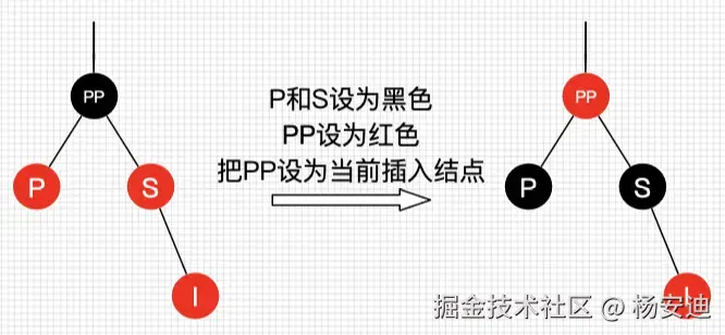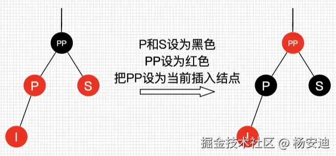 如果插入节点的父节点P和叔叔节点S都是红色,那就将父节点和叔叔节点都变成黑色,将祖父节点PP变成红色(祖父节点原来必定是黑色的),如果此时祖父节点PP的父节点是黑色(图中未展示),那么无需任何处理插入操作结束,但如果祖父节点PP的父节点是红色,那就违反了上下相邻节点不能同是红色的规则,此时需要将PP节点当做新插入的节点再做自平衡操作,直到平衡为止。假如PP节点刚好是根节点,往上没有父节点了,那就必须把PP设置为黑色。