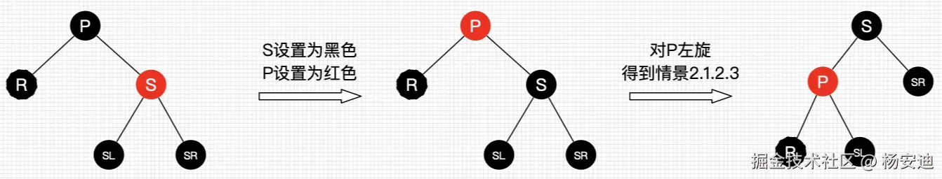 2.1.2.2 兄弟节点是红色(有没有可能不存在兄弟节点?不可能,因为删除节点是黑色叶子节点,如果没有兄弟节点,那么左右的黑高一定不相等,违反了红黑树的规则)