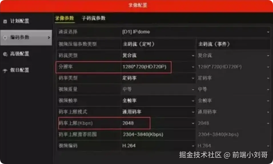 操作路径:主菜单—录像配置—编码参数,录像码流参数/子码流参数中将主/子码流的分辨率和码率上限降低;