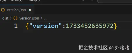 在打包时将当前时间戳作为版本号写入version.json文件中。执行pnpm build后会在dist文件夹下生成version.json文件。
