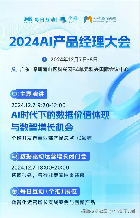 抓住AI风口,共探变革机遇。12月7日-8日,AI产品经理大会将在深圳召开。**每日互动(个推)将在7日上午场带来《AI时代下的数据价值体现和数智增长机会》主题演讲,并在当天举办“数据驱动运营增长”专题闭门会。**同时,在两天的会期中,个推在大会展区也将为现场观众带来数智化运营增长的实战案例与创新产品,助力各位产品官、运营官在AI产品飞速迭代的时代洞察发展趋势,稳抓增长曲线。