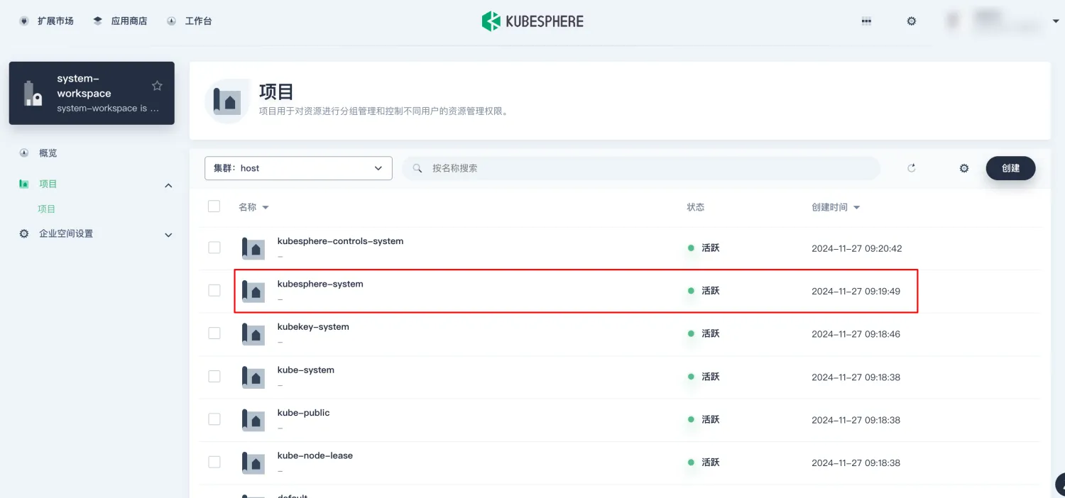 点击“企业空间管理”,选择“KubeSphere-system”项目。