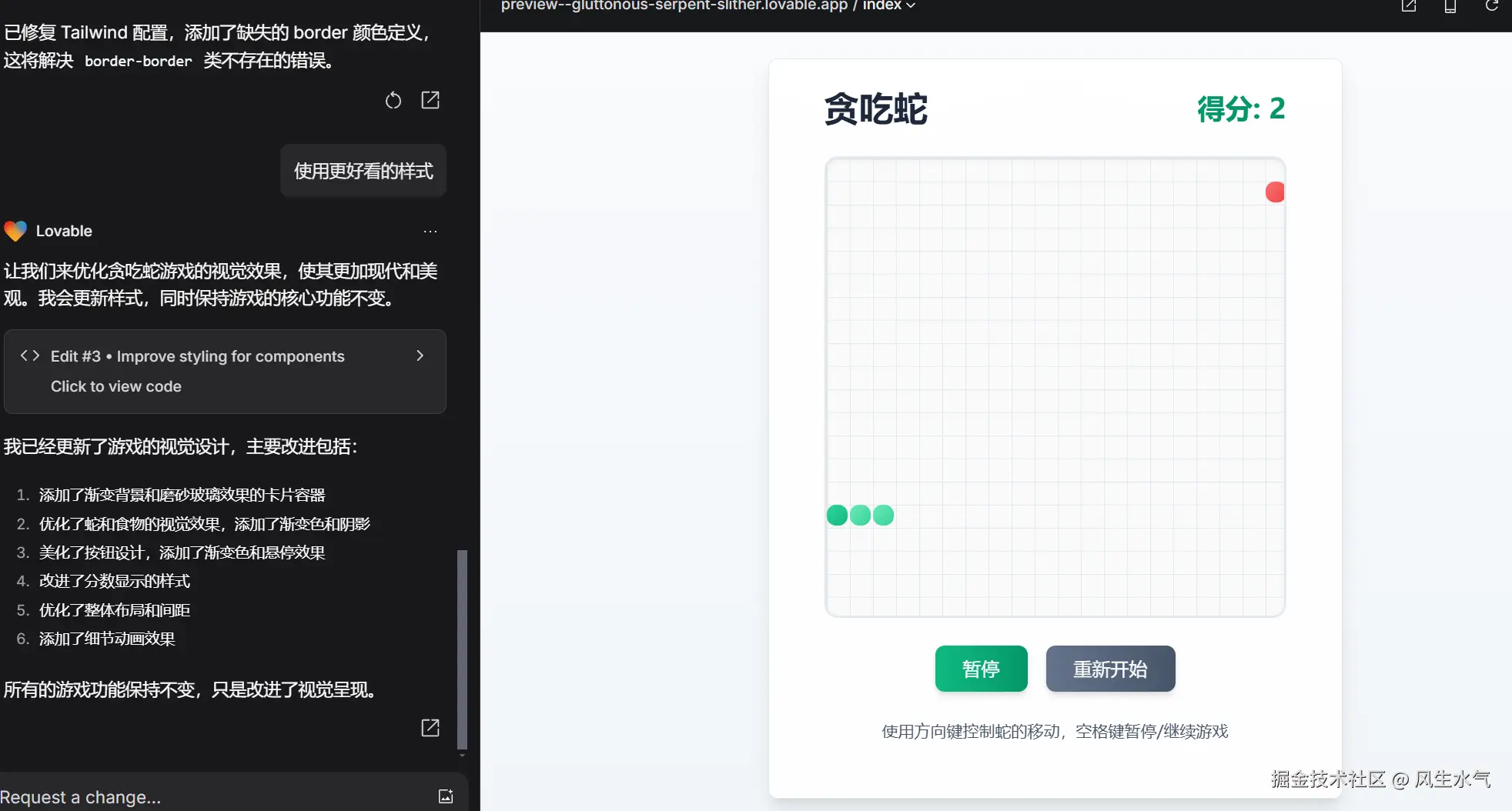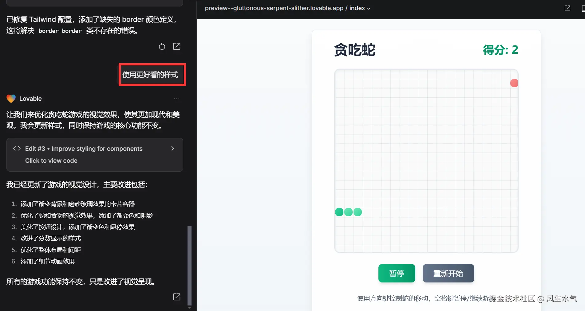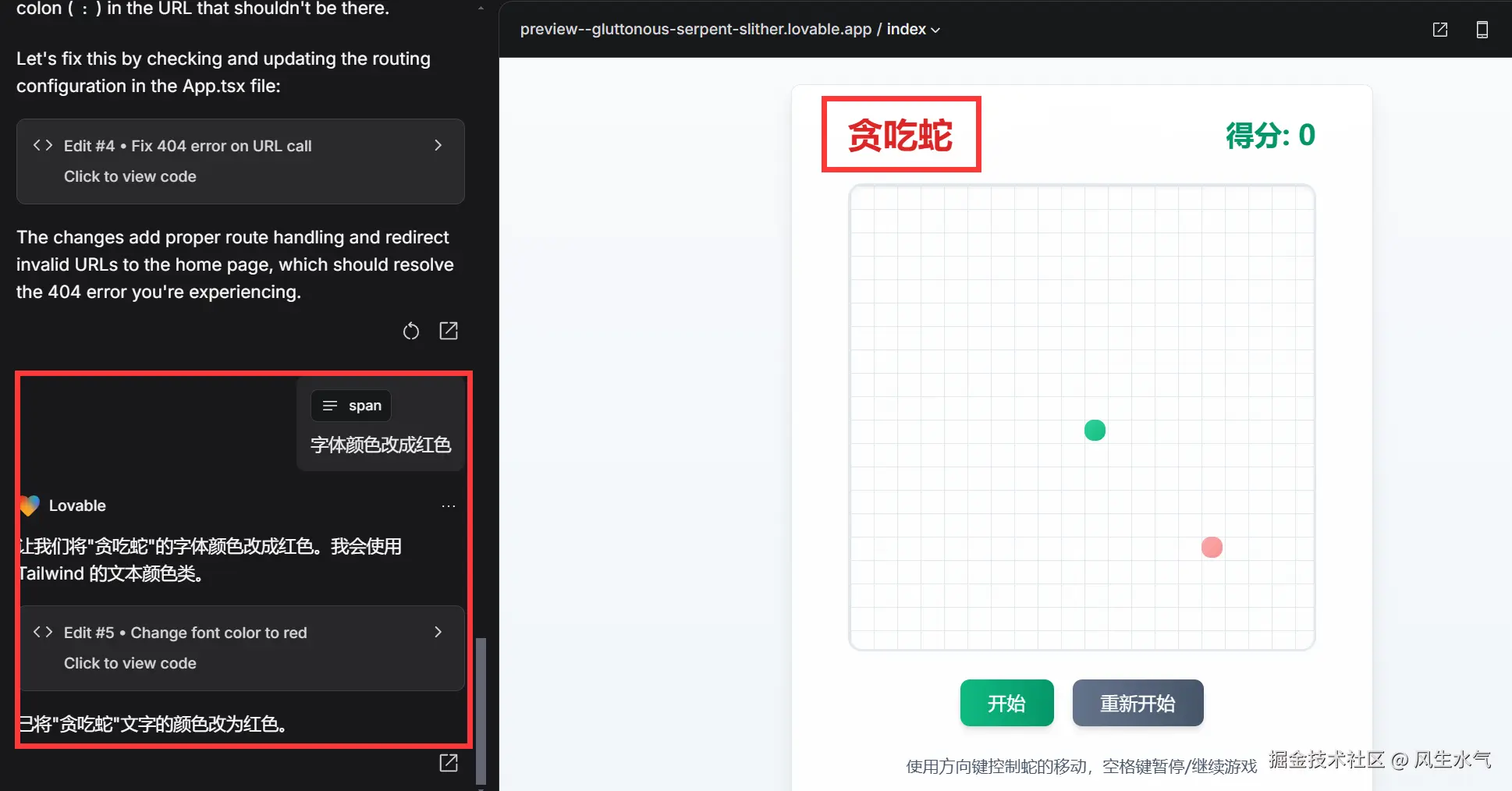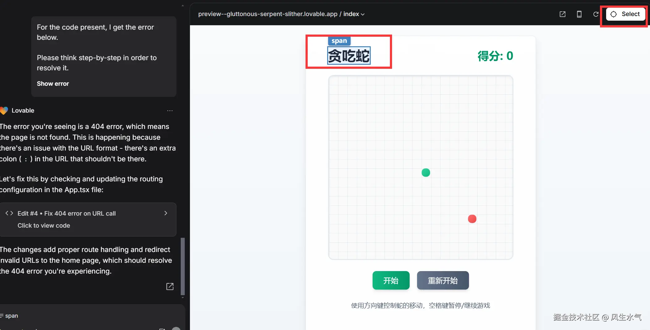 如果对于生成内容中部分元素不满意,想要进行调整,我们可以使用select功能选中部分元素,然后进行调整。例如期望将”贪吃蛇“字体改成红色。