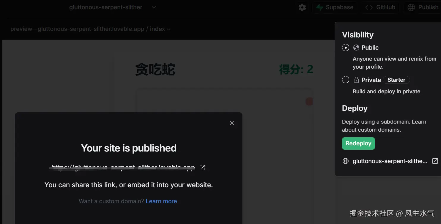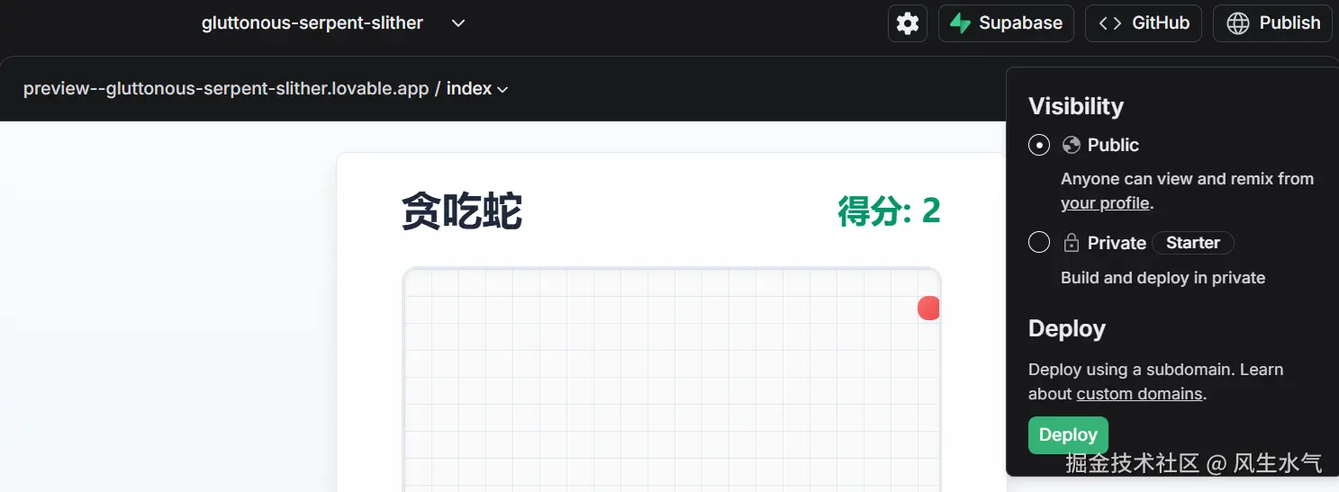使用下来,可以感觉到相比于前面两个工具更加的丝滑。虽然在代码展示这一块不像之前一样树形展示项目,方便阅读,但对于不懂代码的小白用户来说其实毫无影响,甚至减少了他们的困惑点。这是我觉得交互上的一个亮点。另外一键部署能力也非常丝滑,最基本的部署能力几乎不需要做任何配置就可以部署,减少了web应用的开发难度。
