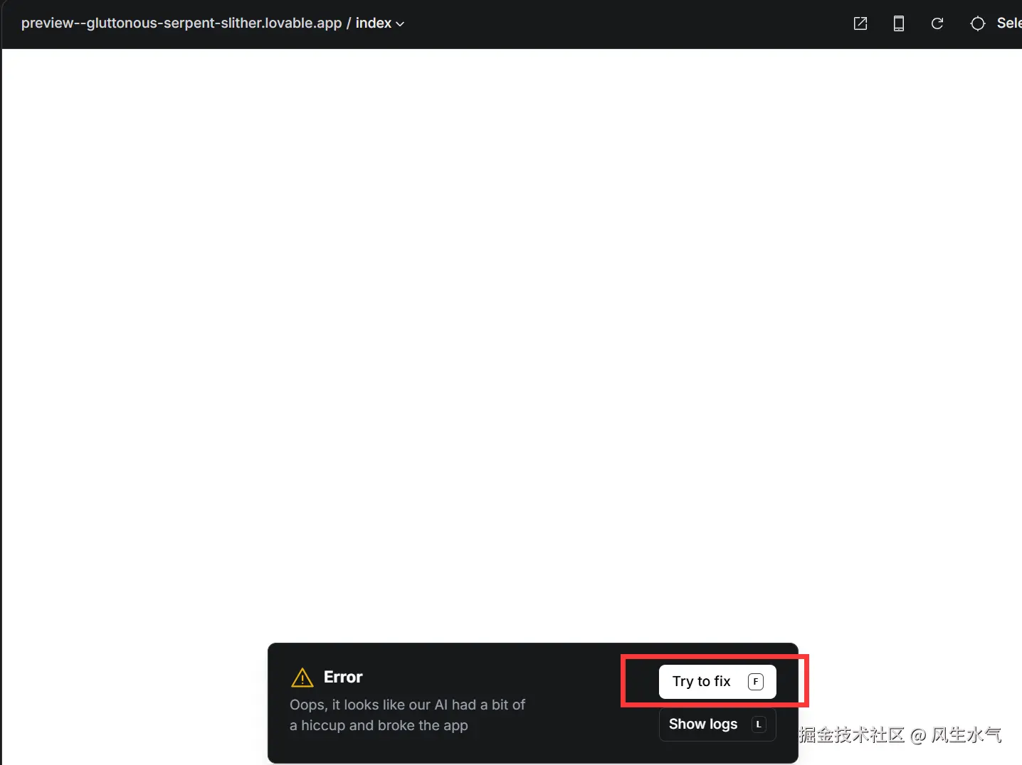 当生成的代码存在问题时,下方会弹出一个按钮提示你进行修复,点击即可修复,不需要用户人工去定位问题,修复代码。