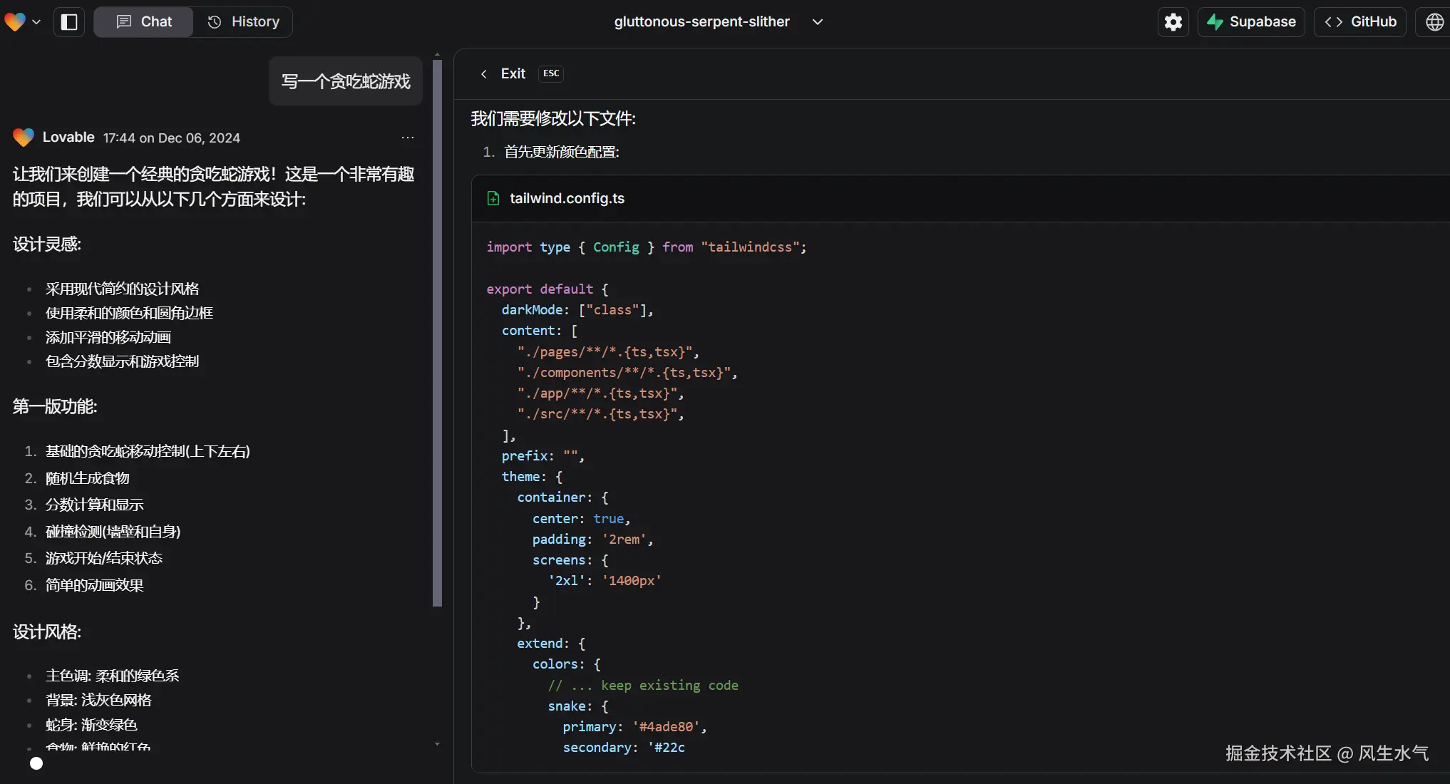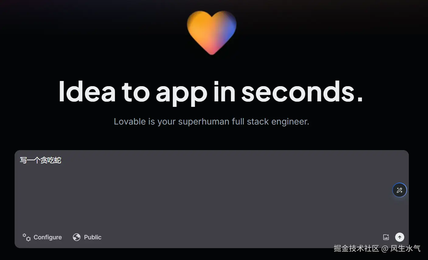 进入网站之后的主页和之前的两个工具一样简洁:除了应用介绍,就是一个可以输入需求的对话框。我们可以在这个对话框中输入我们想要做的应用功能,比如,我们想做一个贪吃蛇游戏,但我们又没有想好更细致的描述我们的游戏想要做成什么样,此时,我们可以在对话框中简单的输入”写一个贪吃蛇游戏",让它先生成一个简单的游戏,之后,我们再基于初版上进行修改和调整。