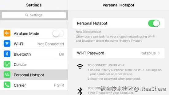 - 打开“个人热点”开始蓝牙连接。