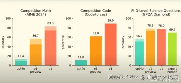 相较于之前的o1-preview版本,满血版o1的综合能力有了显著提升,尤其是在数学计算、代码编写和处理博士级难度的科学问题方面,表现尤为亮眼。以下为官方对比数据:
