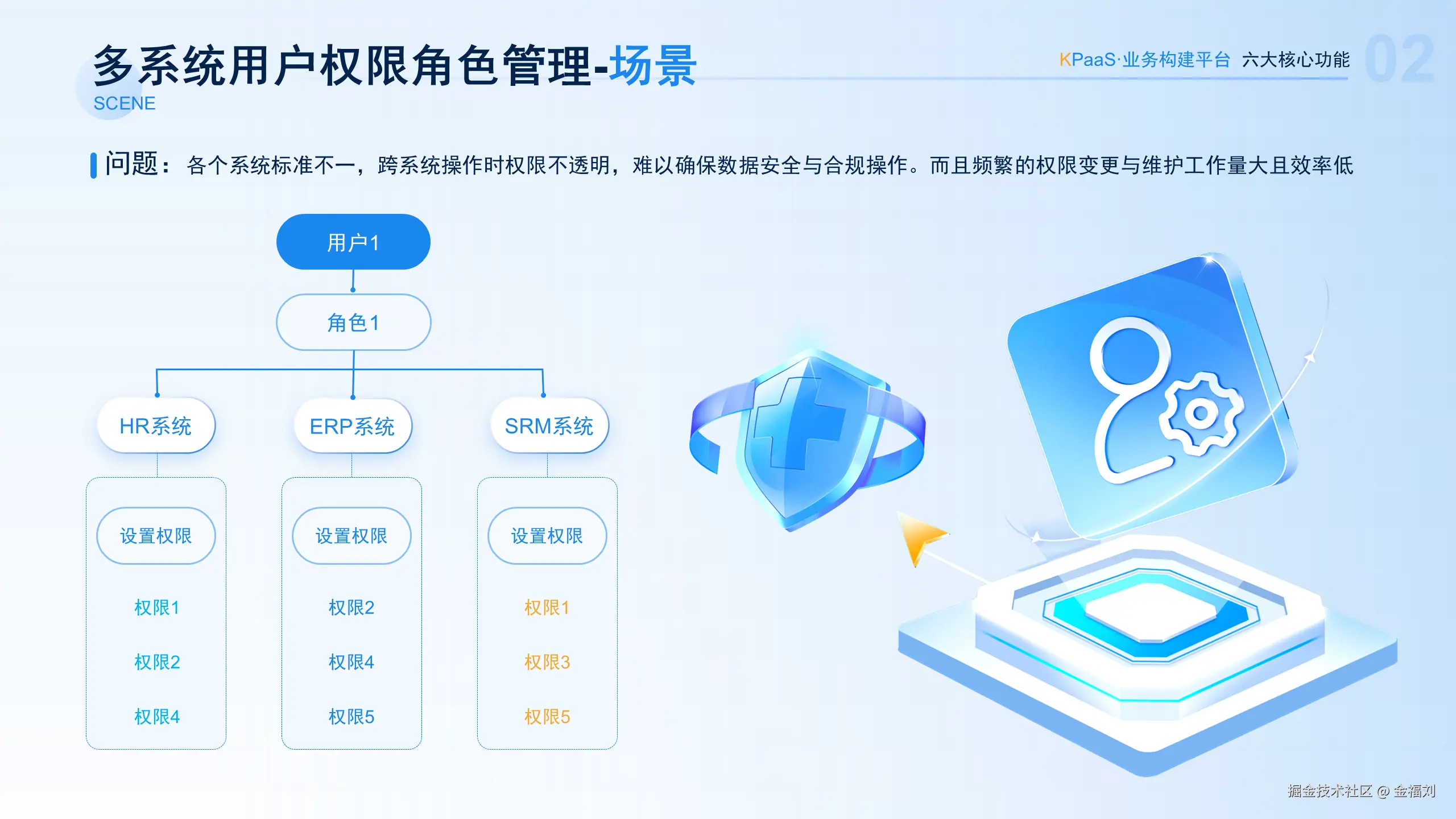通过建立一个集中式权限管理平台(如KPaaS集成平台),企业可以在单一平台上统一配置和分配所有系统的权限,避免了多系统权限管理的重复操作和冗余。