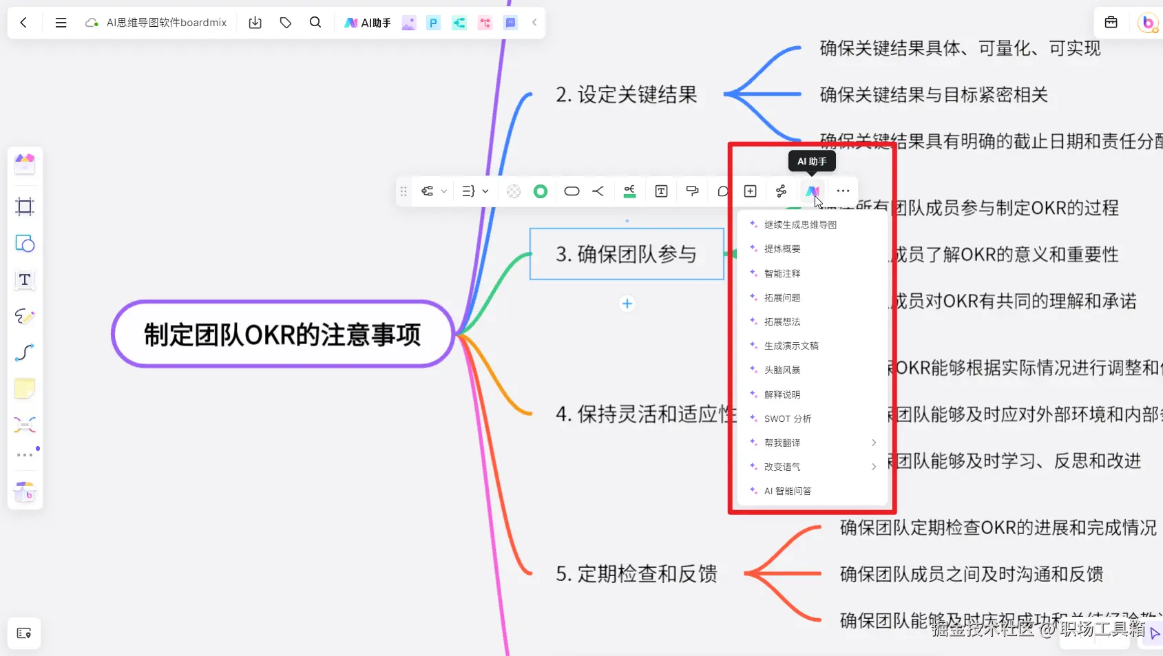 在AI生成的思维导图基础上,我们可以进一步扩充导图的内容,选中任意一个思维导图节点,点击工具栏的「AI助手」,基于选中的导图节点生成新的内容。