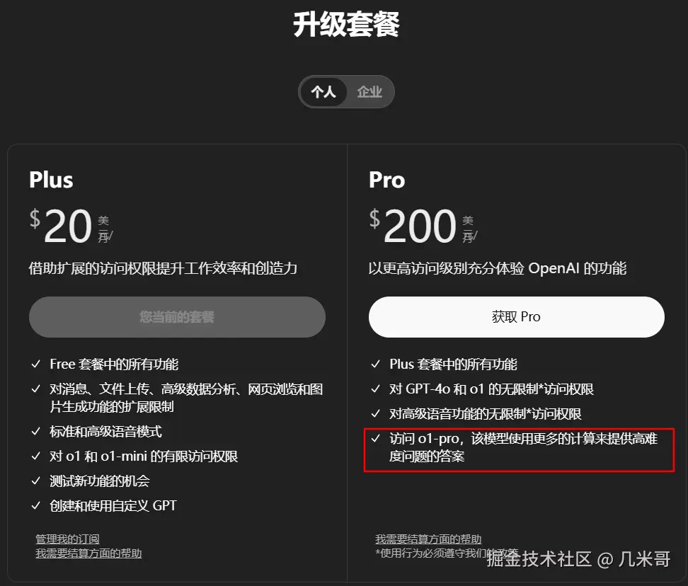 伴随o1的发布,OpenAI推出了 ChatGPT Pro,一个新的订阅计划,旨在提供对o1及其扩展功能的增强访问。Pro计划承诺不限量访问 OpenAI o1 及其 Pro 版本,后者提供更长时间的思考,以提供更可靠的回答。这个高级计划理想地适合需要最先进功能和最佳性能的重度用户。对于想要充分发挥o1潜力的用户来说,ChatGPT Pro 提供了一个激动人心的选择。不过我感觉自己目前是真消费不起,只能给大家截个图展示一下,有实力的朋友可以去进行一番测试!