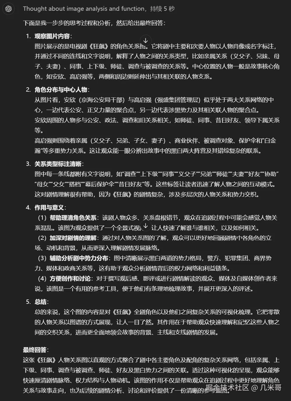 最后再来个复杂的人物关系分析,挑战下o1的极限,我把一份网上做的非常精致的《狂飙》人物关系图发给o1,让它分析下这个图的内容和作用。