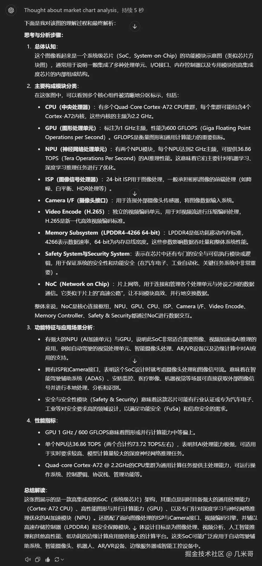 不错,o1通过对架构图的分析,认为这款芯片拥有强大的NPU,ISP和安全模块,所以适合于汽车电子领域,比如自动驾驶辅助系统,分析的相当专业啊。图片上所有的重要信息,性能指标全部提取出来了,并加上了自己的分析和理解!