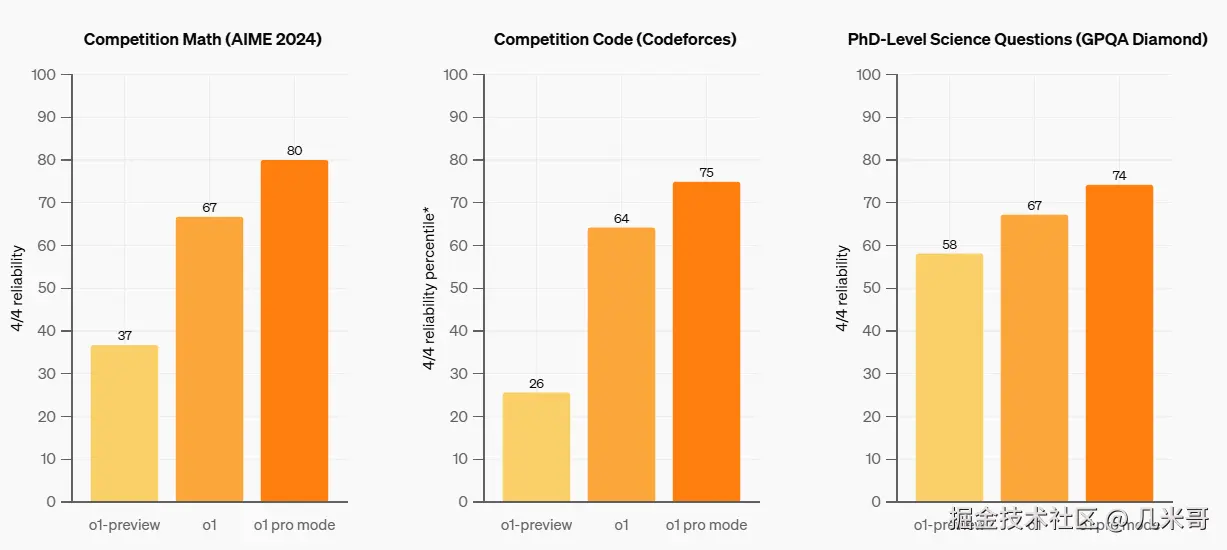 OpenAI o1 不仅仅是一个简单的升级;它是一个经过精炼的模型,设计用于以更高的精准度和速度处理更复杂的任务。经过广泛测试,o1展现了出色的概念性思考能力,能在面对复杂的现实世界问题时,提供更快的响应时间和更少的错误。根据OpenAI的内部测试,o1比其前辈 O1-Preview 在减少重大错误方面胜出34%。这一改进使o1更为可靠,无论是编程帮助、数学解答还是更复杂的写作辅助。此外,OpenAI还专门推出了o1 pro模式,这是o1的一个版本,使用更多计算能力来更深入思考,旨在为最难的问题提供更好的答案。下图是OpenAI展示的o1-preview,o1,还有o1-pro mode三者在数学、科学和编码等具有挑战性的机器学习基准测试中的表现。