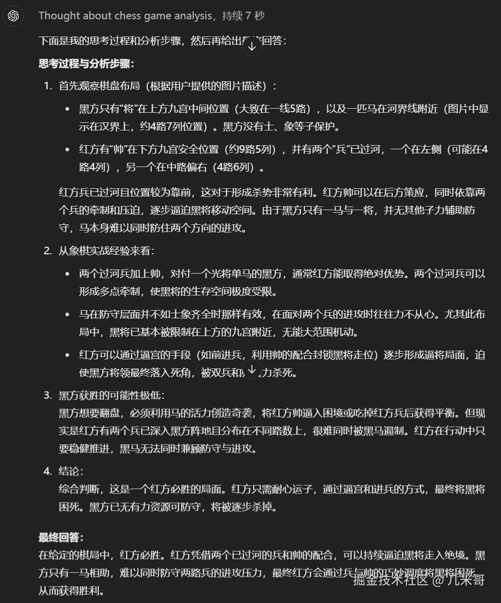 再来个视觉挑战,看象棋残局分析胜负,看看o1的智商如何。这个残局是双高兵例胜单马,双兵在帅的助攻下,伺机运用等着,可逼进九宫取胜单马,所以是个红方胜的局面。不知道o1能否看出来?