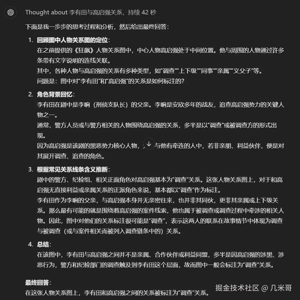 o1看出了图片的作用,也看出了标注的作用,同时也抓住了重点,看出来安欣和高启强是这个关系网的中心人物。确实不错,不过我突发奇想,问他个看图说话的问题:图片上说李有田和高启强什么关系?没想到o1居然翻车了,哈哈,这个问题o1居然思考了42秒,明显是有点烧脑了。然后回答如下图: