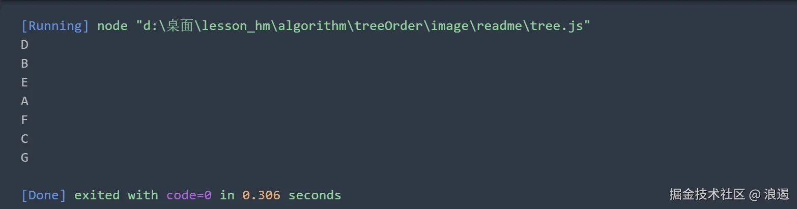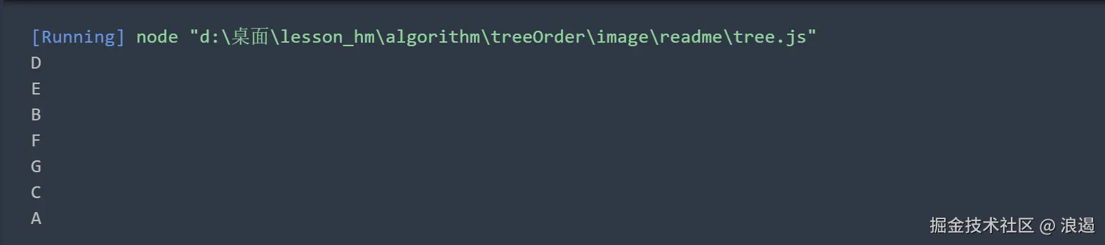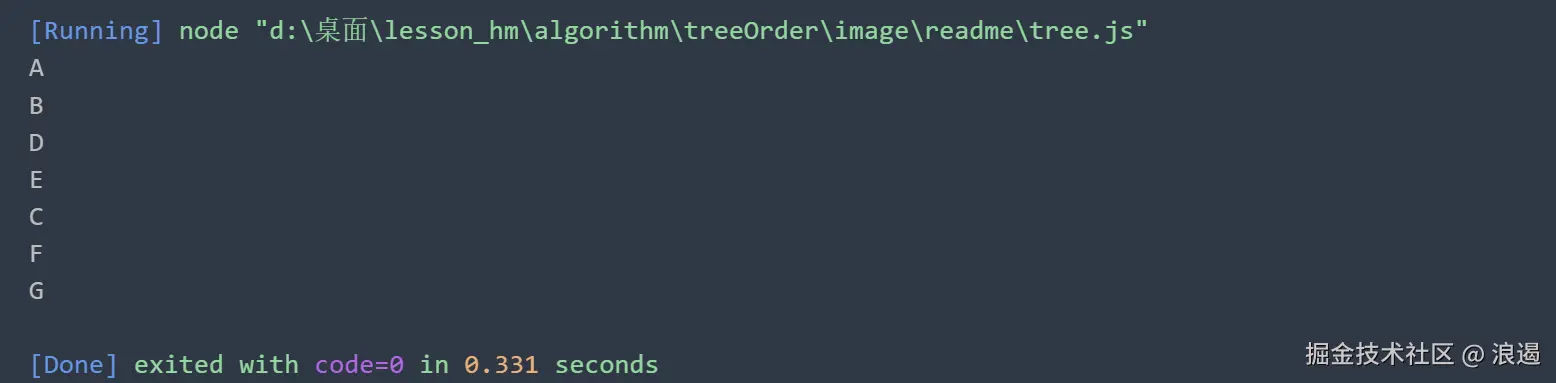 而该函数是在遍历右子树 , 控制台会继续输出 , C F G , 当走到 G 的时候 , G左节点为 NULL , 终止该层递归 .