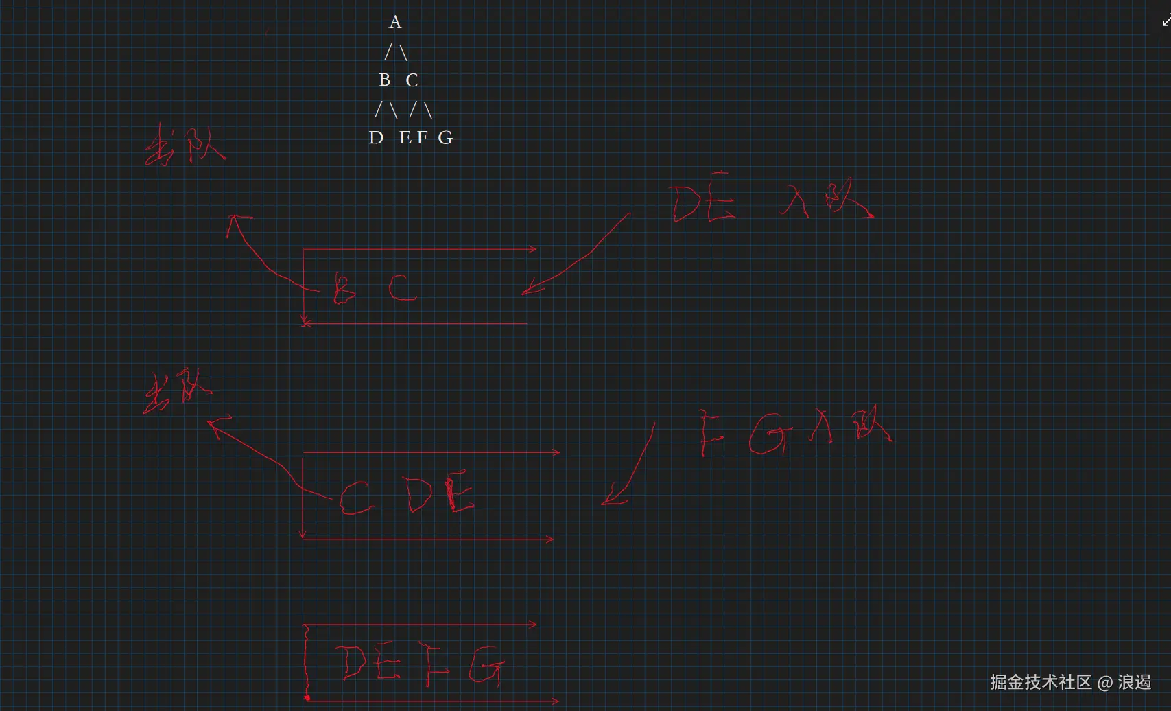 这个过程就恰好是队列的思想 , A 出队列 , B C 入队列 , 就得到了第二层元素