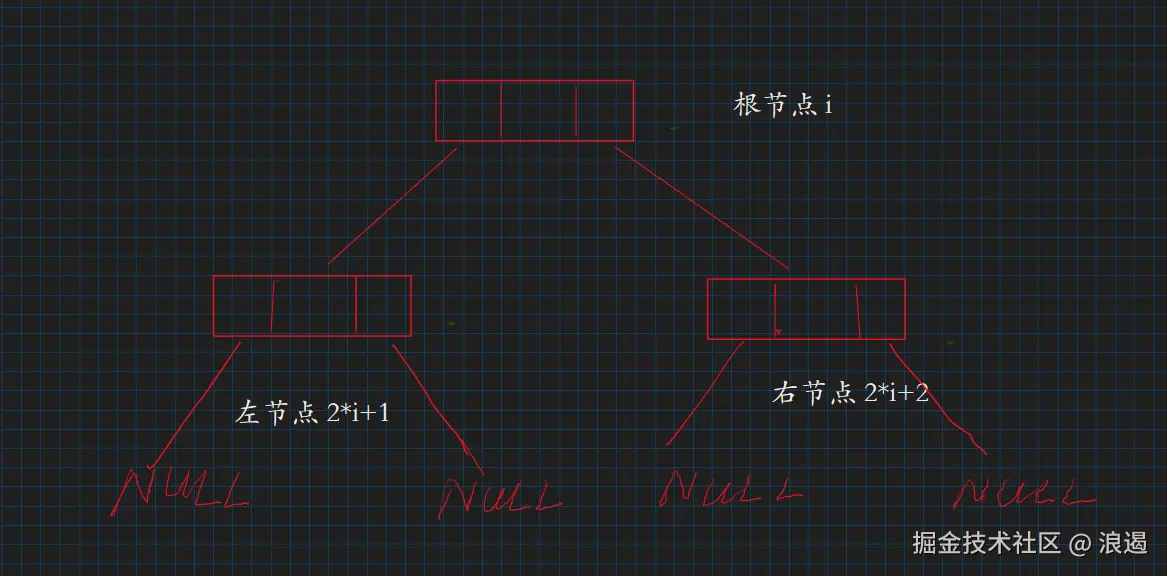 所以一颗二叉树 ,可以利用父子关系 , 在数组中通过下标计算来表示每个节点的位置 , 在数学关系上 , 形成一颗树 。