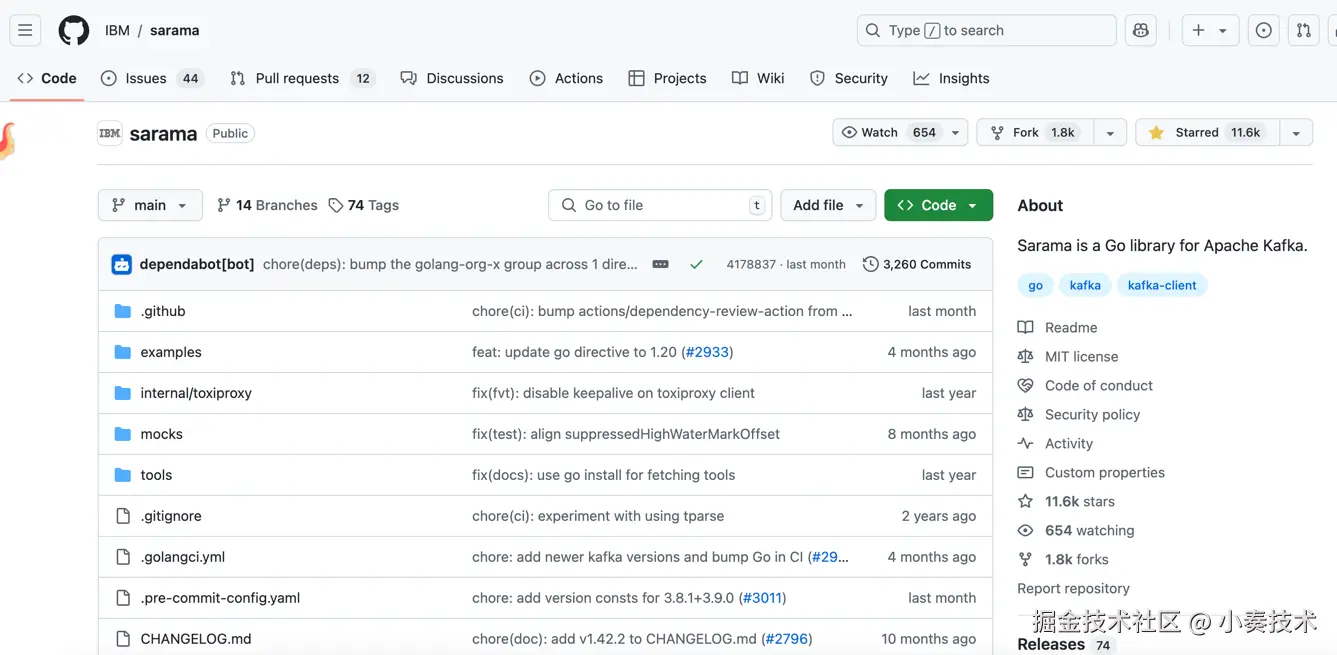 IBM sarama的star数量目前是所有开源kafka golang sdk中最多的,有11.6k