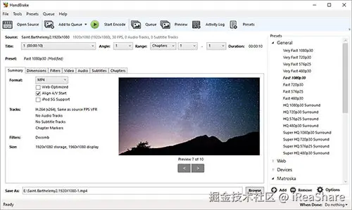 当您将视频文件上传到软件上时,您可以将它们转换为多种文件格式,并使用许多预设进行处理。令人满意的是,它让您可以自由地消除抖动、提高比特率、降低分辨率等等。然而,它并没有提供官方教程,这可能是最大的不便之一。以下是使用 HandBrake 将 iPhone 视频转换为 MP4 的详细步骤: