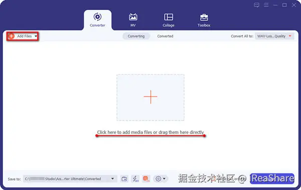 免费下载后,在计算机上安装并打开产品。从左上角选择“添加文件”,然后选择“添加文件”或“添加文件夹”以上传 iPhone 视频(需要将视频从 iPhone 传输到计算机吗?)。或者,只需将多个视频/音频文件拖到软件的此界面即可。