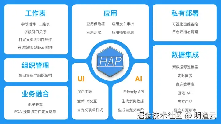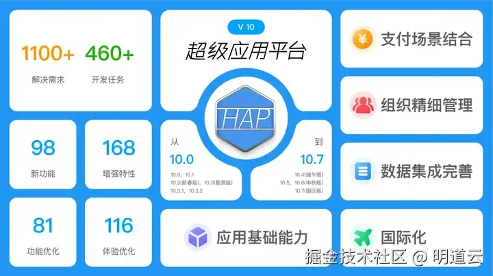 明道云产品总监薛宗铭总结了过去一年以来HAP在产品研发上的成果。去年伙伴大会后,HAP从零代码应用平台升级为超级应用平台并发布 V10,历经 8个大版本和若干小版本迭代,完成近 500 个开发任务,解决伙伴 1100 多个需求,包括近 100 个全新功能特性和 168 个功能增强特性,同时不断优化产品功能和交互体验。