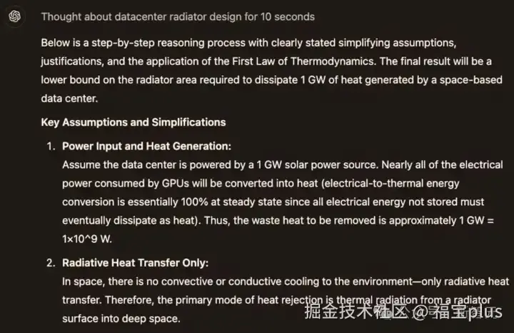 在未来,OpenAI可能会在太空环境中训练模型,功率数值是1吉瓦。 这是一个简化的数据中心空间示意图。对于任何细节假设,请提供相应的理由。如果受到了规范辐射的影响,你的任务是估算这个包含GPU的数据中心的辐射损失面积。在此过程中,还需要回答以下问题: 1)你如何处理太阳和宇宙辐射? 2)热力学第一定律如何应用到这个问题中?