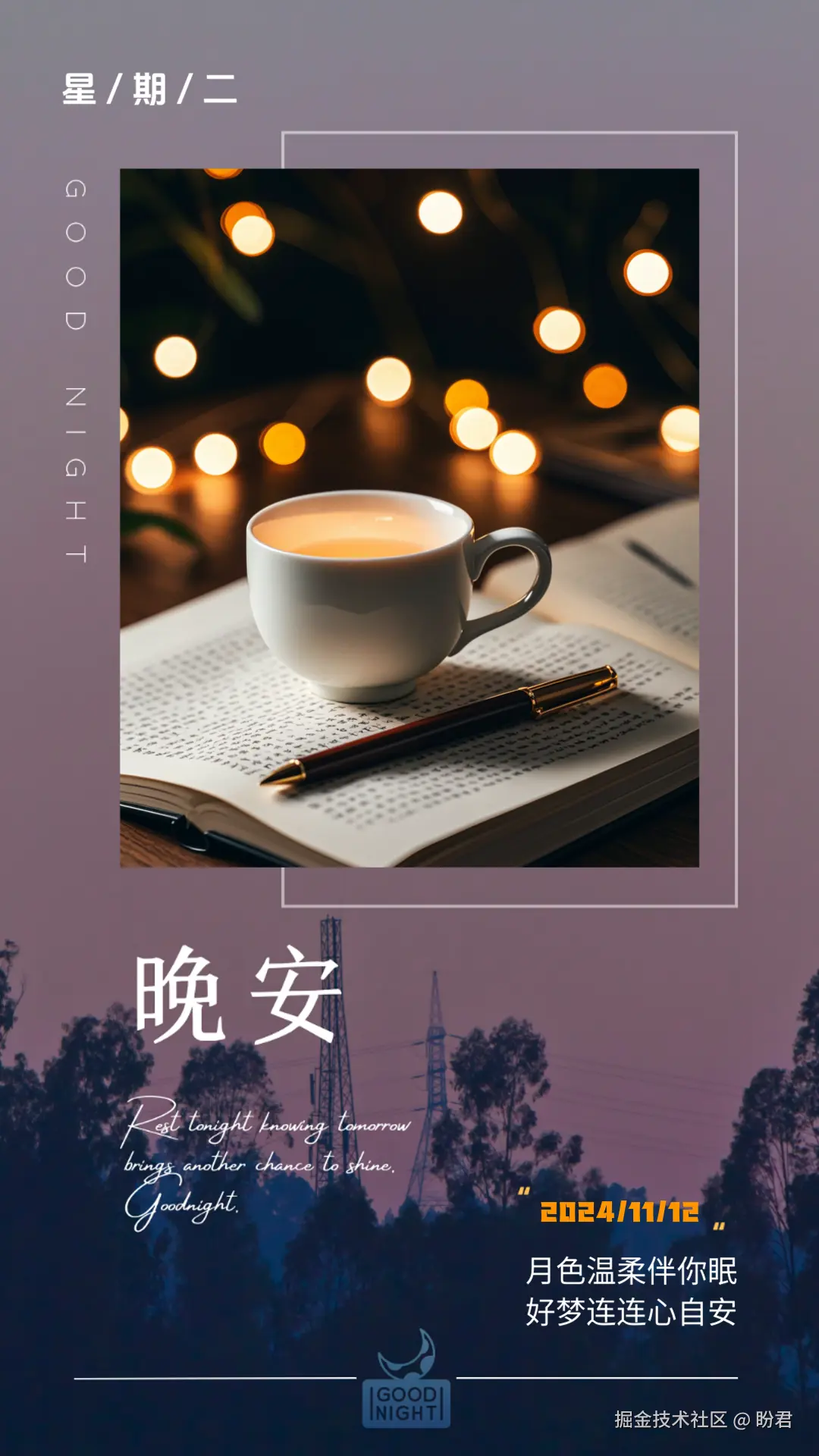1. 优先考虑与夜晚相关的元素,如宁静的夜空、柔和的灯光、月光等。