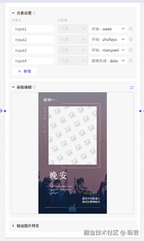 1) 编写一个工作流来实现上面的几个步骤。配图、祝福语采用 AI 来生成。