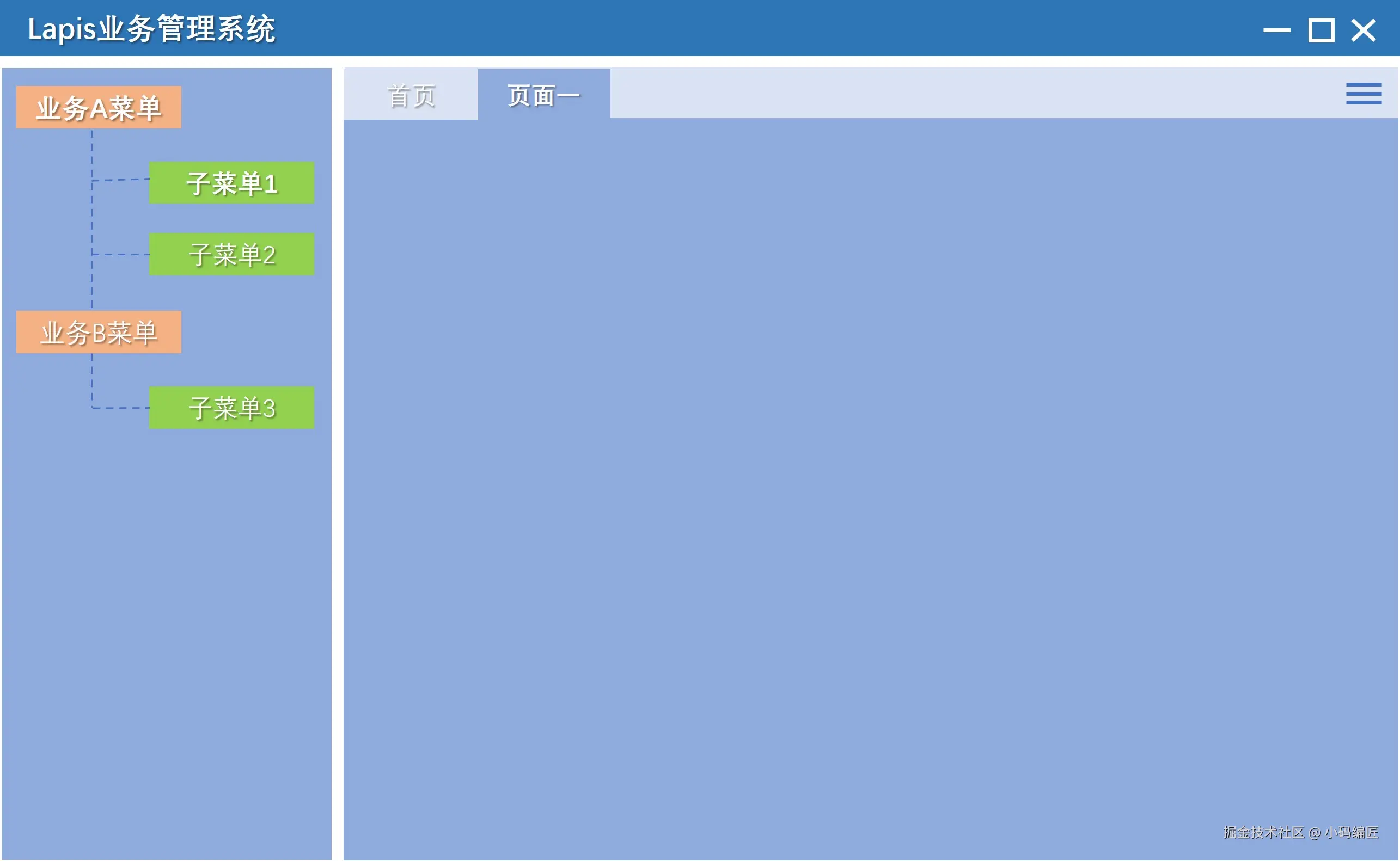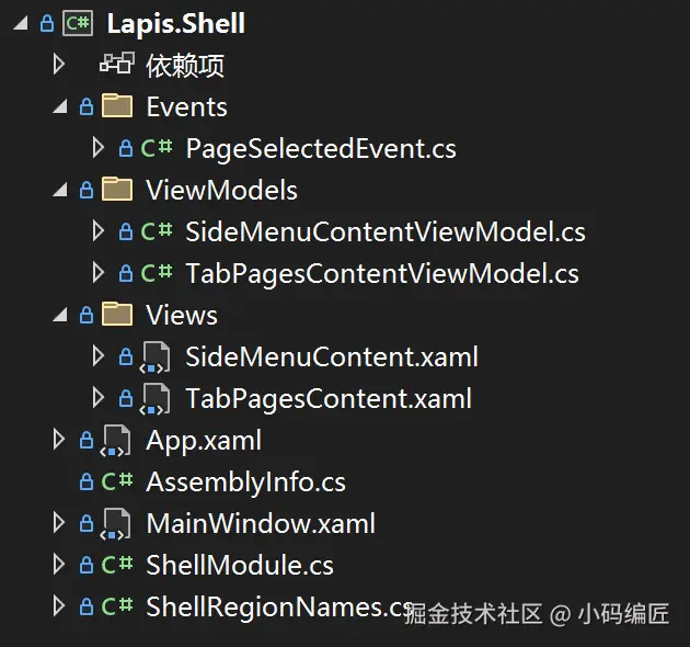 Lapis.Shell: 是一个启动模块,负责启动/初始化应用程序(加载模块和资源),它包含App启动类、主窗口、侧边菜单和Tab页内容视图及对应的视图模型等。