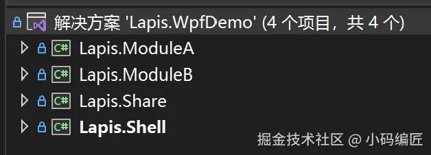 首先,新建一个名为Lapis.WpfDemo的解决方案,分别创建以下四个不同项目: