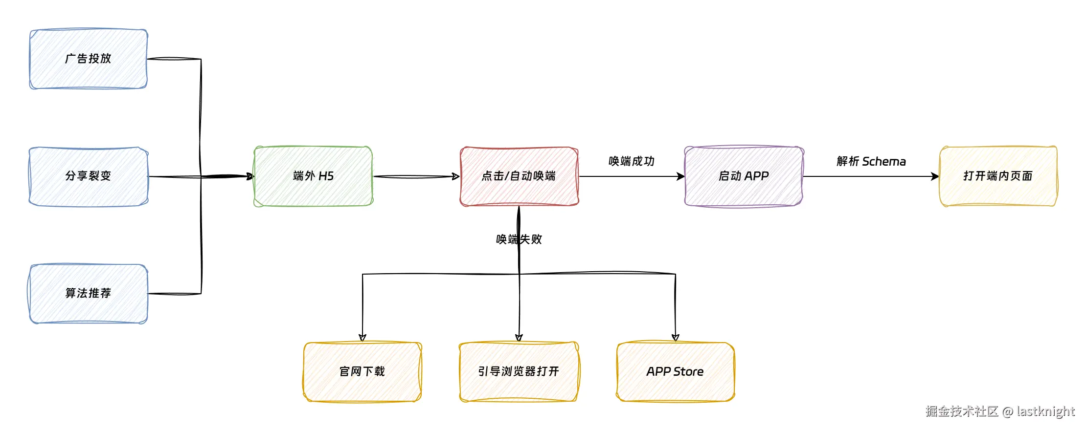 这些手段的形式大多都是准备一个 H5 页面,这个 H5 是在别的 APP 打开的,当用户打开这个页面的时候,能通过某种手段打开自己的 APP 或者引导未下载 APP 的用户下载 APP,这个打开自己 APP 的过程就叫做唤端。