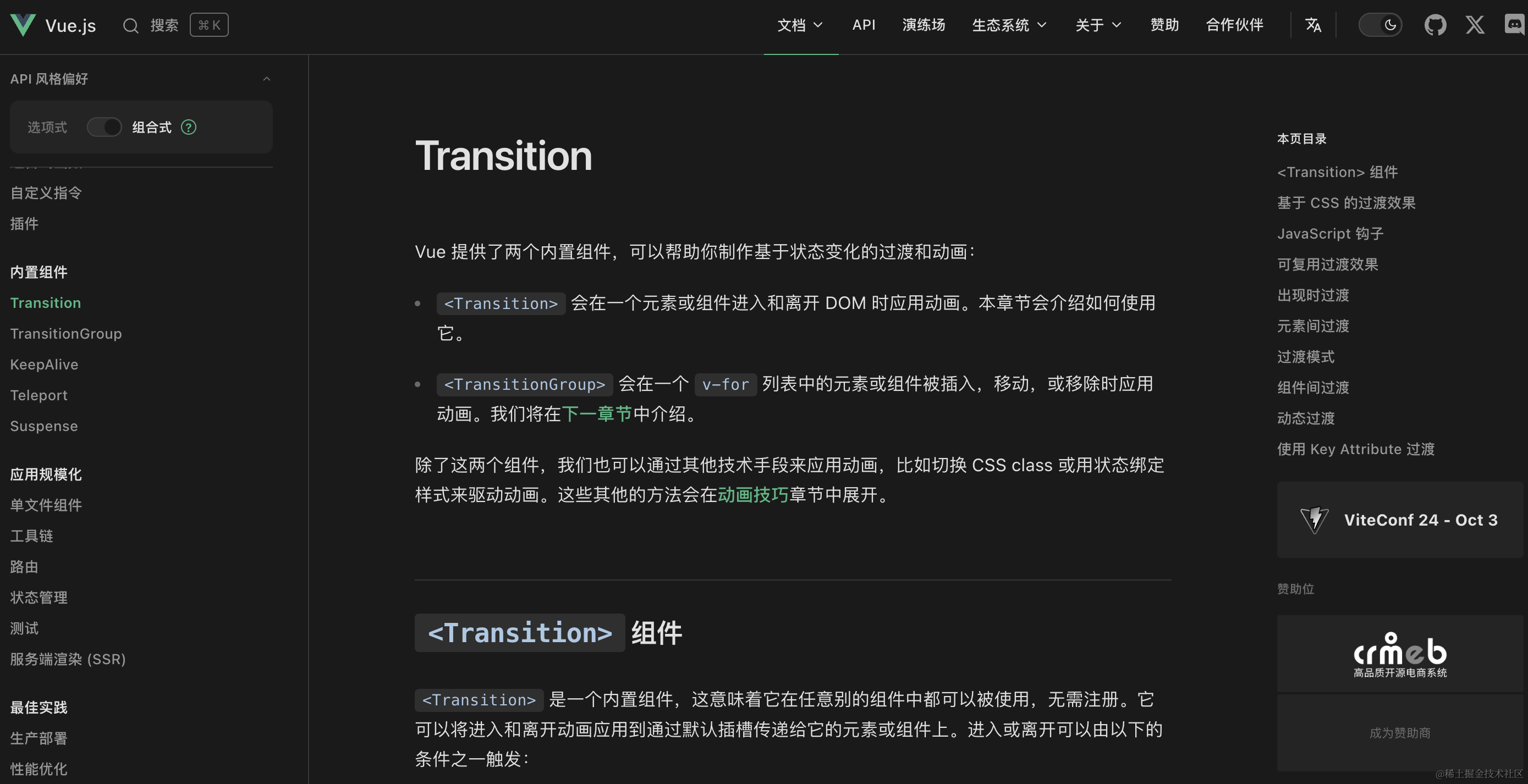 <Transition> 一般都会搭配原生 CSS 过渡一起使用,正如你在上面的例子中所看到的那样。这个 transition CSS 属性是一个简写形式,使我们可以一次定义一个过渡的各个方面,包括需要执行动画的属性、持续时间和速度曲线。