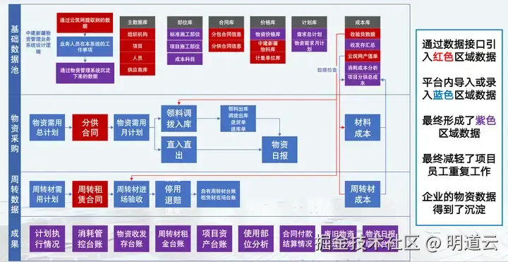物资模块表单设计类似项目管理工具,分为红、蓝、紫三个区域。红色是从上级单位数据库或异构系统引入的数据,蓝色是本系统录入的数据,紫色是可输出到其他模块或报表的数据,这减轻了基层员工负担并沉淀了企业数据。之后以产品思维发展,形成物资管理系统早期界面,并凭借交付能力对接不同业务部门,克服架构障碍,将平台功能从以部门为核心拓展到子业务,如以商务为核心实现数据聚合和价值创造。
