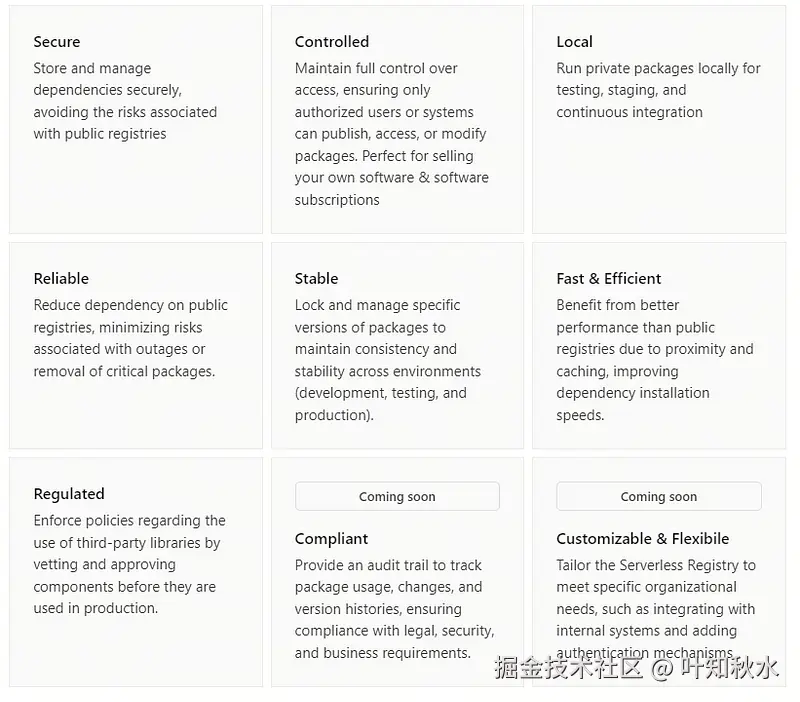 这三款软件都涵盖了软件包发布和安装等基本功能,但 vsr 独特地融合了无服务器技术和细粒度访问控制,使其与众不同。