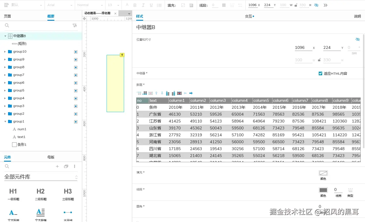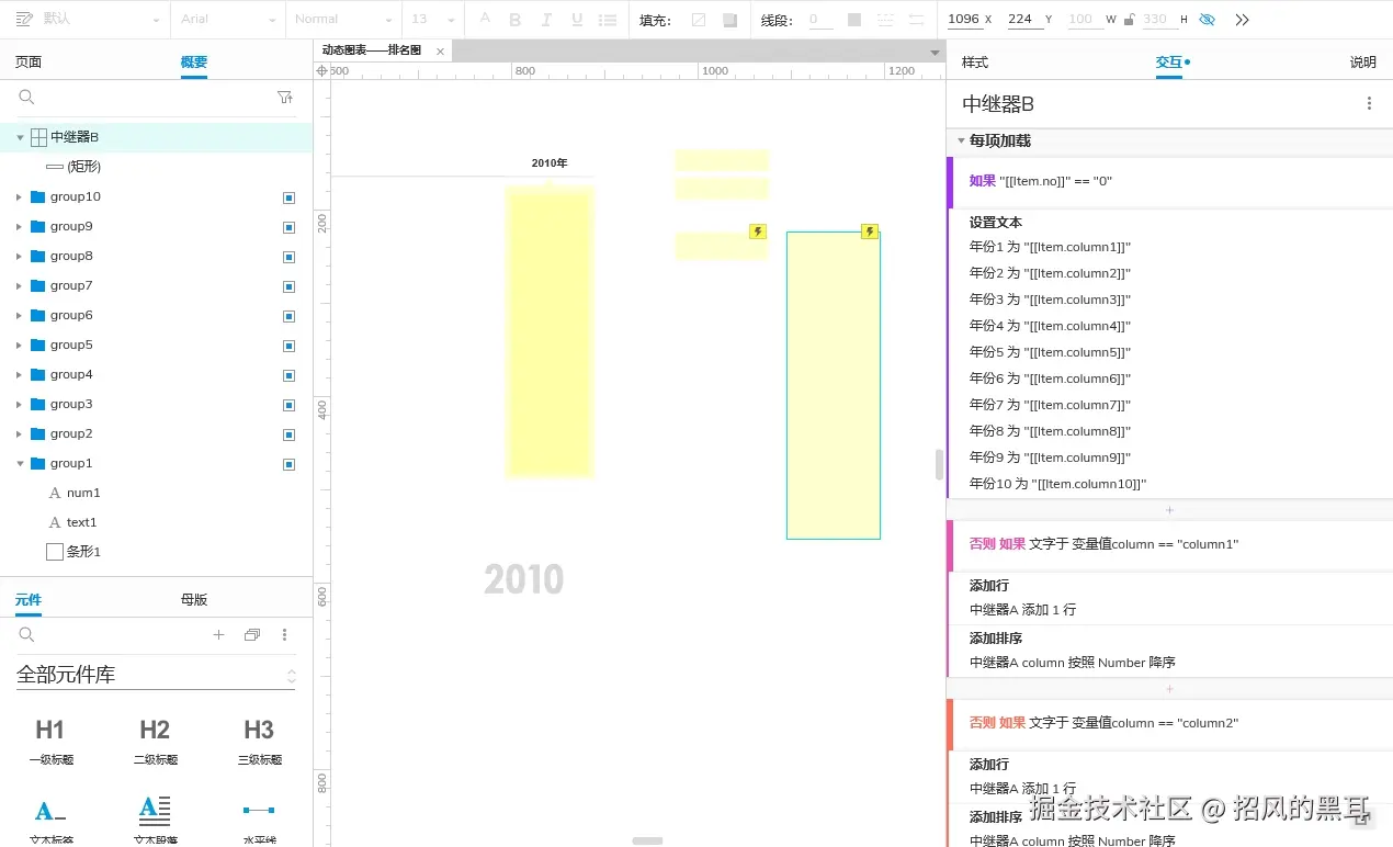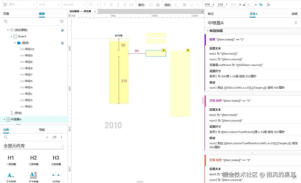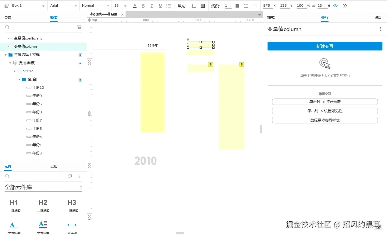 - 补充:考虑后期可直接作为元件使用,这里没用使用全局变量,而是再页面拖入了两个矩形分别记录变量数据,这里命名为"变量值column"和"变量值coefficient"。变量值column:用来记录选择的年份;变量值coefficient:用来记录计算得到的系数(用作设置条形的尺寸,条形宽度=中继器A列column的数值*系数,系数=条形最大宽度/中继器A列column的最大值)
