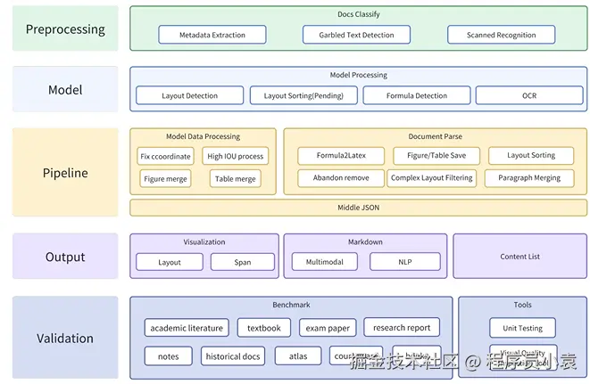 PDF文档分类预处理:在处理PDF文档之前,MinerU首先对文档进行分类,识别其类型(如文本型、图层型或扫描版PDF),并进行相应的预处理,例如检测乱码和识别是否为扫描文档。