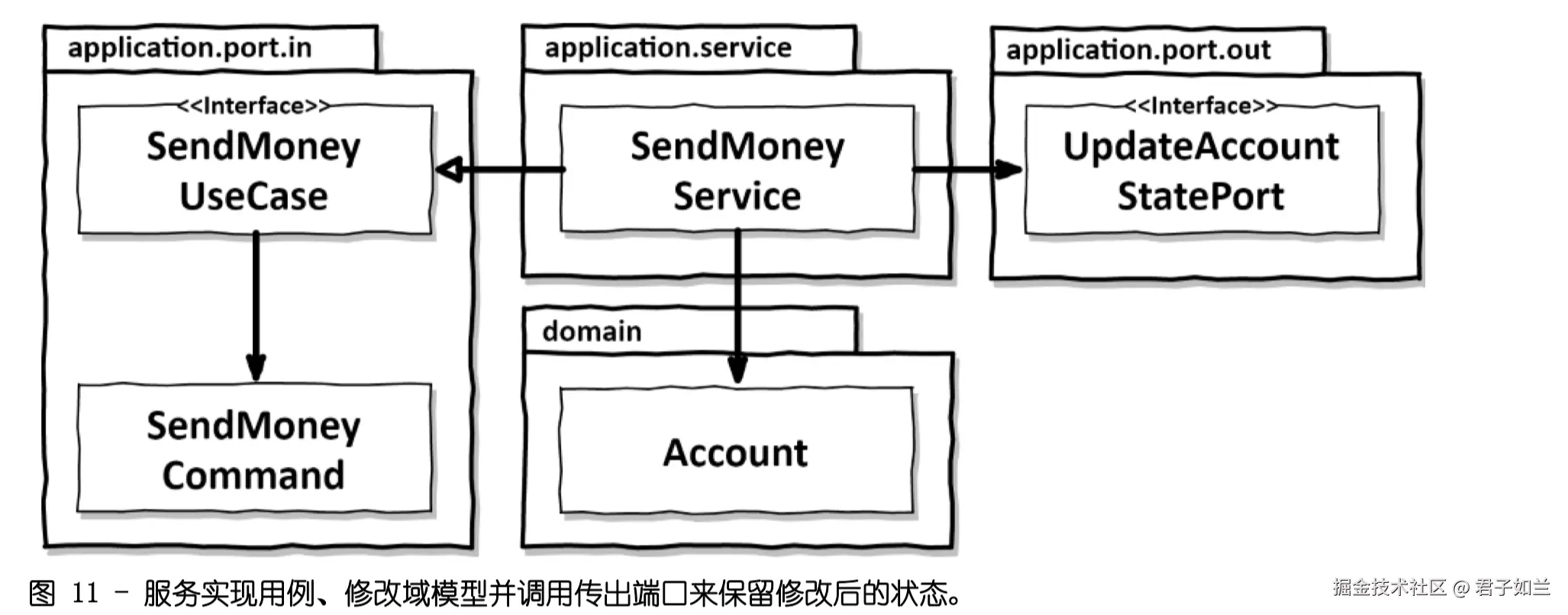 该服务实现输入端口接口 SendMoneyUseCase 并调用输出端口接口 LoadAccountPort 来加载账户,并调用端口 UpdateAccountStatePort 将更新的账户状态保留在数据库中。