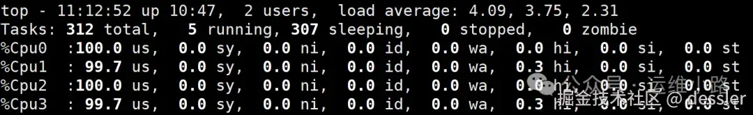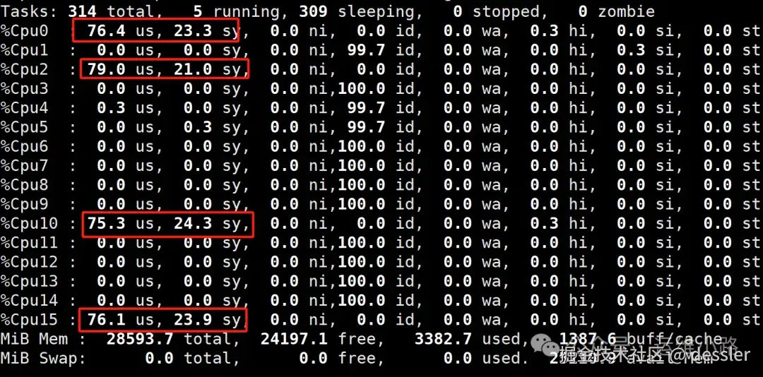 我们从上面的图可以看到,这个shell进程使用了4个cpu的全部资源,从下面的图中可以看到,它实际使用的cpu编号是0,2,10,15。我们在讲Linux进阶命令-top有提到过这个sy的占用率应该很低才对,目前占用已经达到20%以上,前面的us部分才是进程真正干活的使用的cpu,也就是显示是100%,实际只有不到80%的cpu在干活。