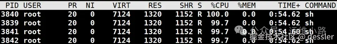 脚本的内容同样都是while死循环,但是它这里的cpu资源全部给了us也就是程序在使用,性能会比前面一个高20%。