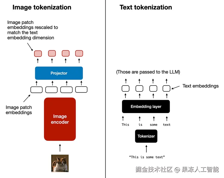 图示:再对比一次,图像和文本的分词过程。这里 projector 的作用就是让图像 token 嵌入的维度和文本 token 嵌入的维度匹配。