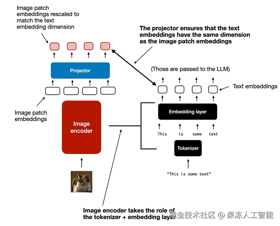 就像文本在送进 LLM 前要分词和嵌入一样,图像的嵌入是通过图像编码器模块(而不是分词器)来搞定的,如下图所示。