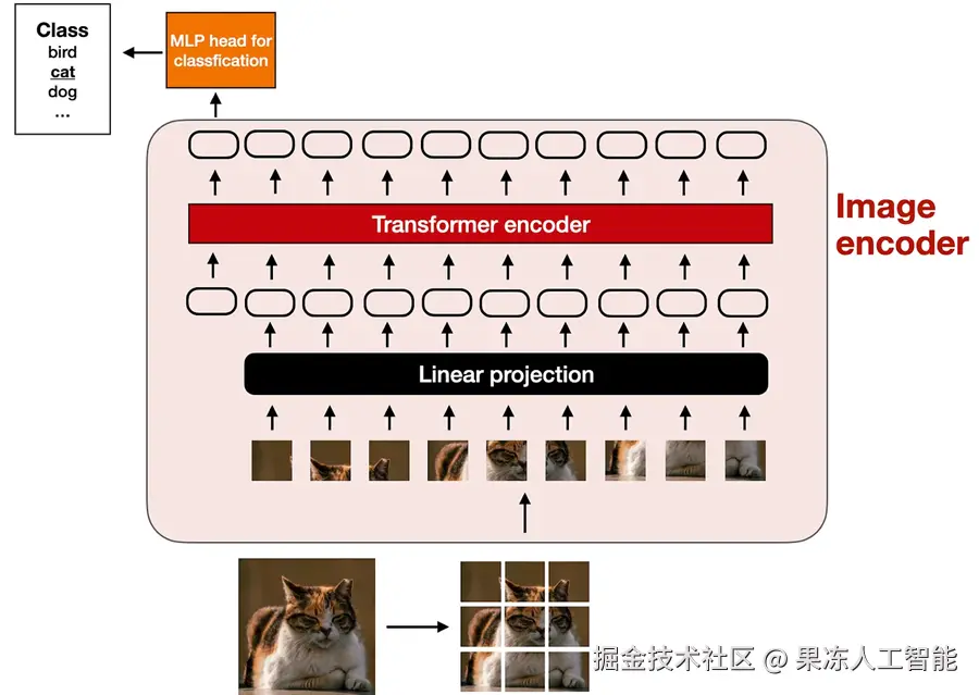 图示:经典的 Vision Transformer (ViT) 架构,类似 2020 年那篇 “An Image is Worth 16x16 Words” 里的模型。